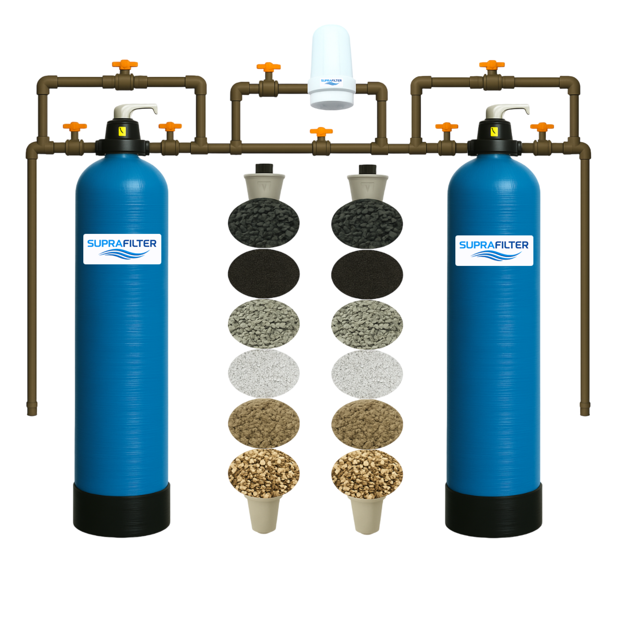 O Filtro Central Duplo SPF3m3h da marca SupraFilter é a solução ideal para quem busca água potável de alta qualidade para consumo humano. Com um sistema de filtração que trata até 3000 litros por hora, este purificador é projetado para remover substancias indesejadas como ferro, ferrugem, bactérias, coliformes, agrotóxicos e toxinas, garantindo uma água limpa e saudável.