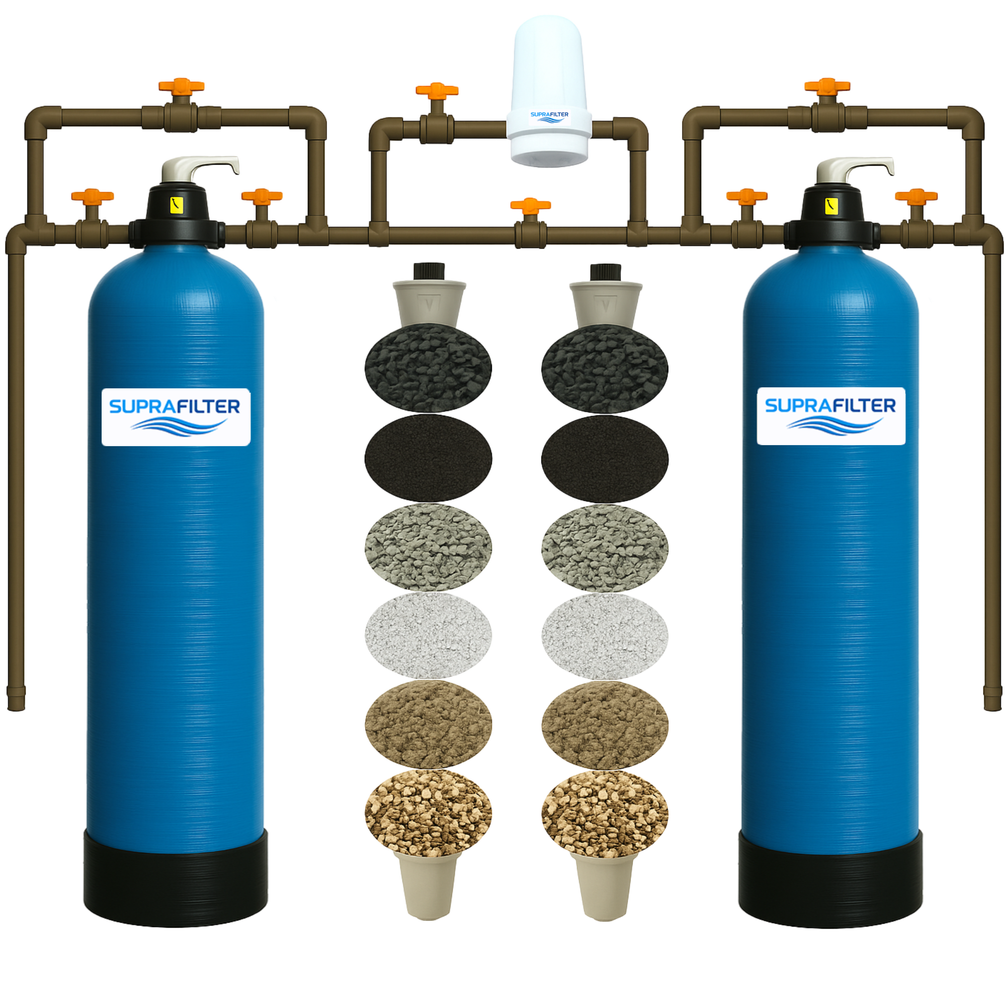 O Filtro Central Duplo Trata Alto Teor Ferro Manganes SPF4m3h da marca SupraFilter é a solucao ideal para quem busca água potável de qualidade superior. Com um sistema de filtracao que processa até 4000 litros por hora, ele garante a remocao eficaz de substancias indesejadas, como ferro, ferrugem, bactérias, coliformes, agrotóxicos e toxinas, além de eliminar cor, turbidez, sabor e odor.