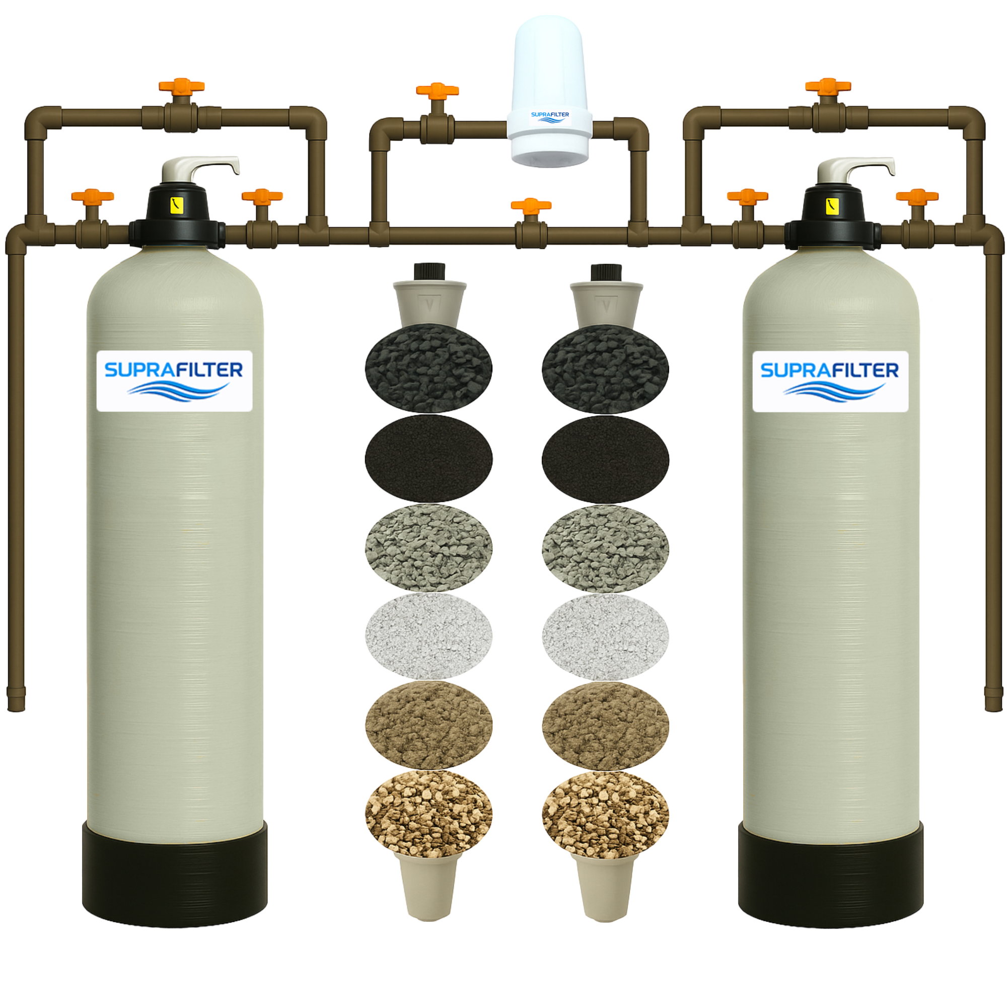 O Filtro Central Duplo Trata Alto Teor Ferro Manganes SPF4m3h da marca SupraFilter é a solucao ideal para quem busca água potável de qualidade superior. Com um sistema de filtracao que processa até 4000 litros por hora, ele garante a remocao eficaz de substancias indesejadas, como ferro, ferrugem, bactérias, coliformes, agrotóxicos e toxinas, além de eliminar cor, turbidez, sabor e odor.