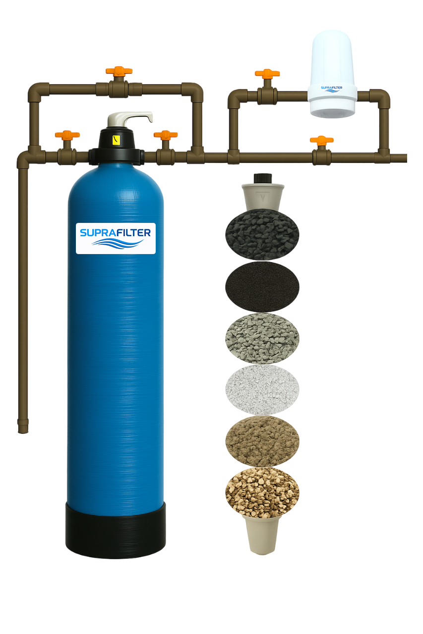 O Filtro Central 6 Camadas Ferro Manganês Coliformes SPF3m3h Bege da marca SupraFilter é uma solução ideal para o tratamento de água potável destinada ao consumo humano, com uma capacidade de filtragem de até 3000 litros por hora. Este sistema é projetado para atender diversos ambientes, como residências, clínicas, estabelecimentos comerciais e pequenos condomínios, garantindo água limpa e saudável para toda a família ou organização.