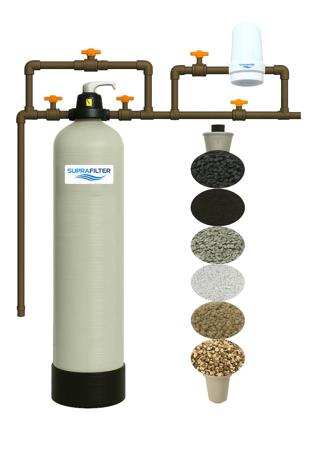 O Filtro Central 6 Camadas Ferro Manganês Coliformes SPF3m3h Bege da marca SupraFilter é uma solução ideal para o tratamento de água potável destinada ao consumo humano, com uma capacidade de filtragem de até 3000 litros por hora. Este sistema é projetado para atender diversos ambientes, como residências, clínicas, estabelecimentos comerciais e pequenos condomínios, garantindo água limpa e saudável para toda a família ou organização.