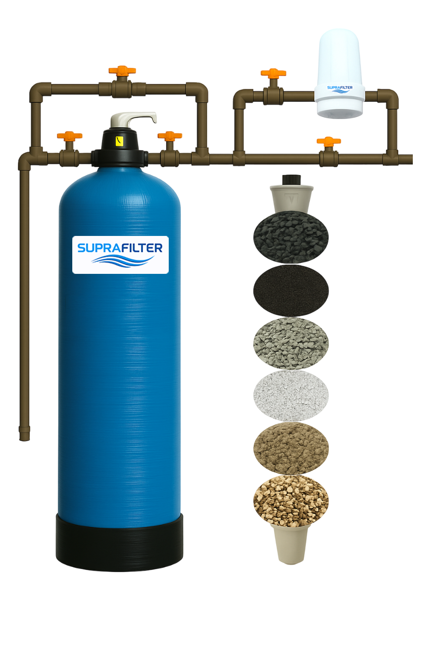 O Filtro De Água Central Elimina Partículas Coliformes SPF6m3hda marca SupraFilter é a solução ideal para quem busca água potável de qualidade para consumo humano. Com um fluxo máximo de 6000 litros por hora, este sistema de filtração central garante a remoção eficaz de substancias indesejadas, como bactérias, coliformes, ferro, ferrugem, agrotóxicos e toxinas.